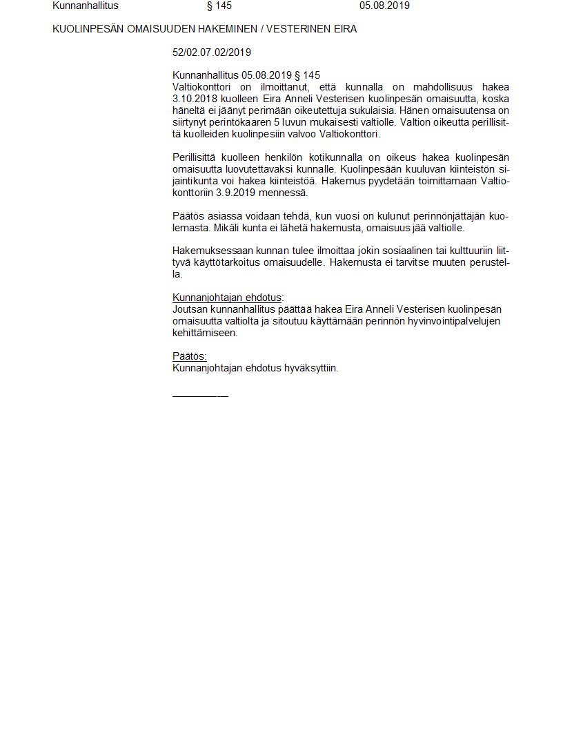 Pöytäkirja 05.08.2019/Pykälä 145