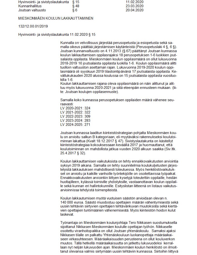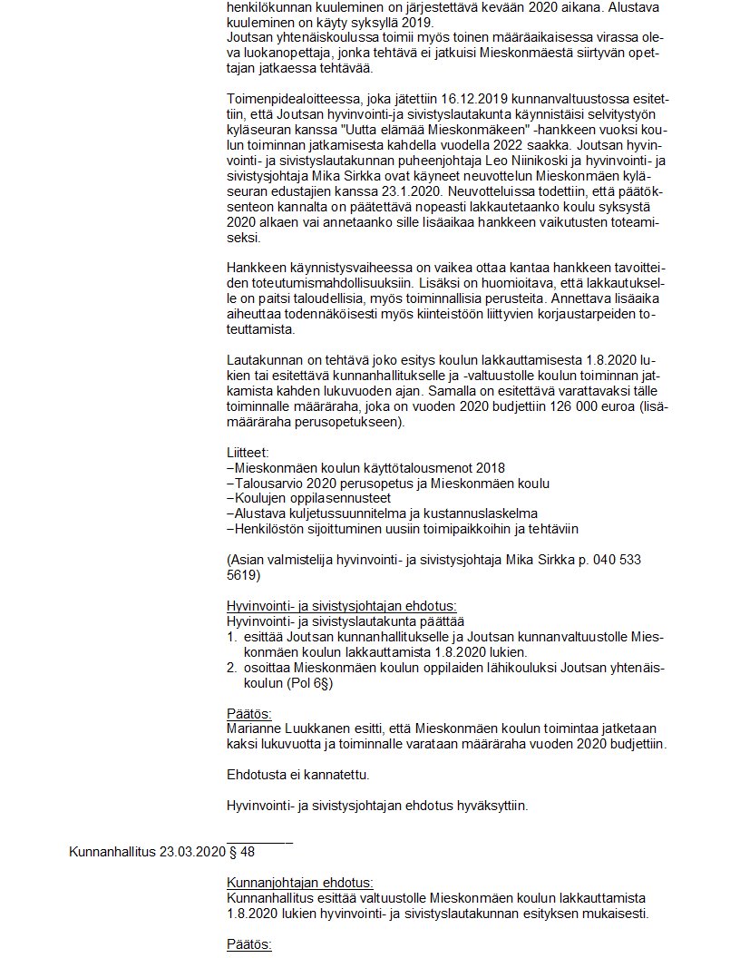 | Liite 4 | ERIÄVÄ MIELIPIDEN, MIESKONMÄEN KOULUN LAKKAUTTAMINEN VALT 20.4.2020 | |