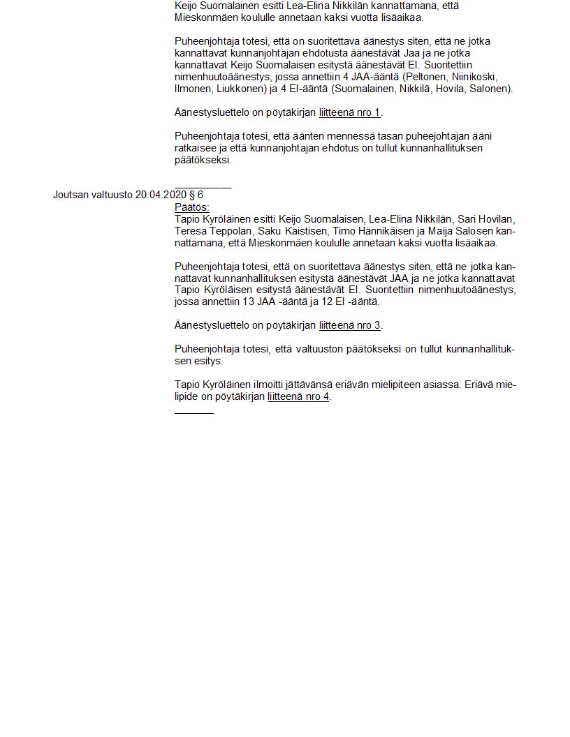 | Liite 5 | ÄÄNESTYSLUETTELO; MIESKONMÄEN KOULUN LAKKAUTTAMINEN VALT 20.4.2020 § 6 |