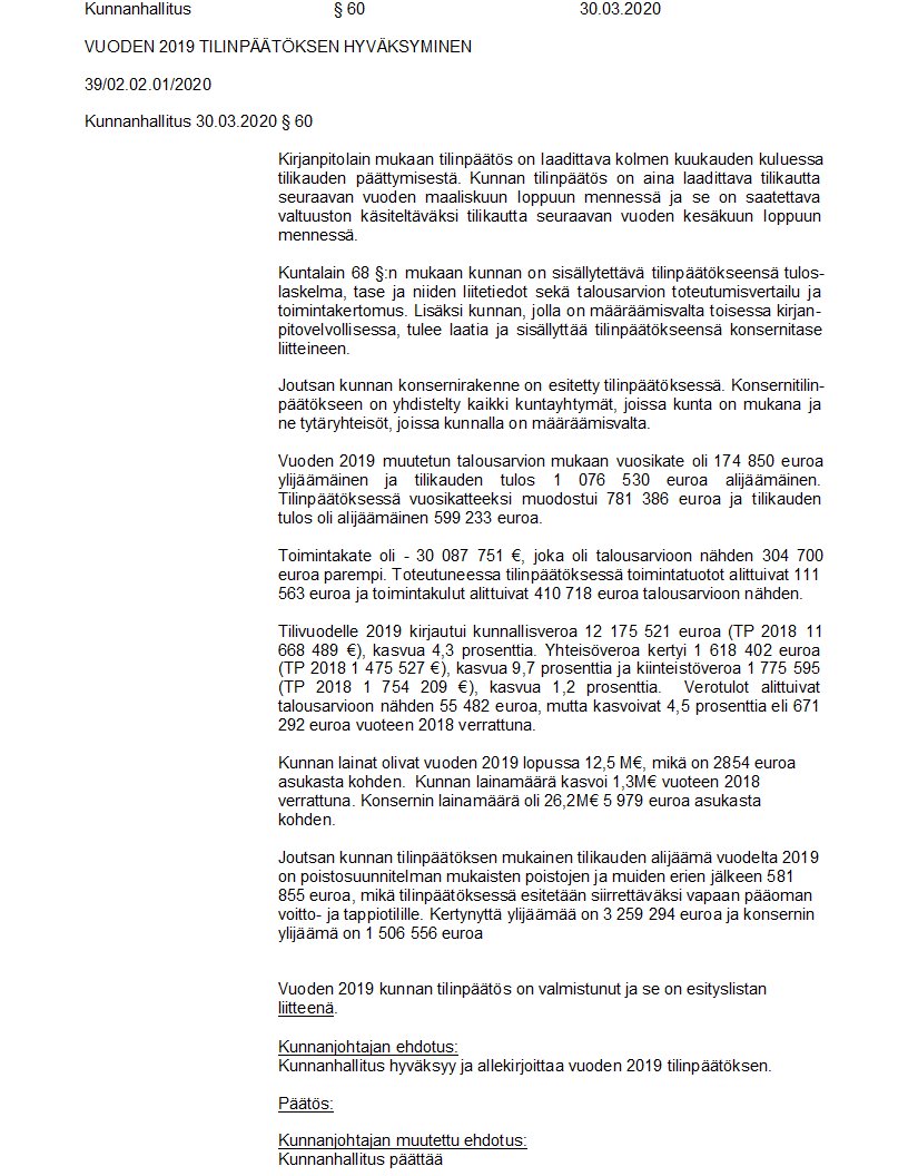 Liite 2  TILINPÄÄTÖS 2019 KH 30.3.2020