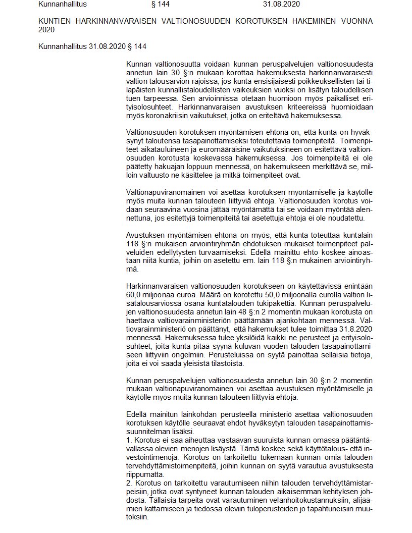 Pöytäkirja 31.08.2020/Pykälä 144