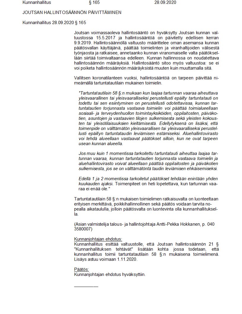 Pöytäkirja 28.09.2020/Pykälä 165