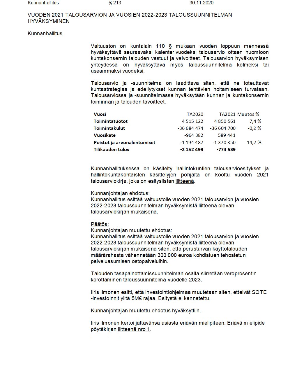 | Liite 3 | ERIÄVÄ MIELIPIDE KH 30.11.2020 / TALOUSARVIO |