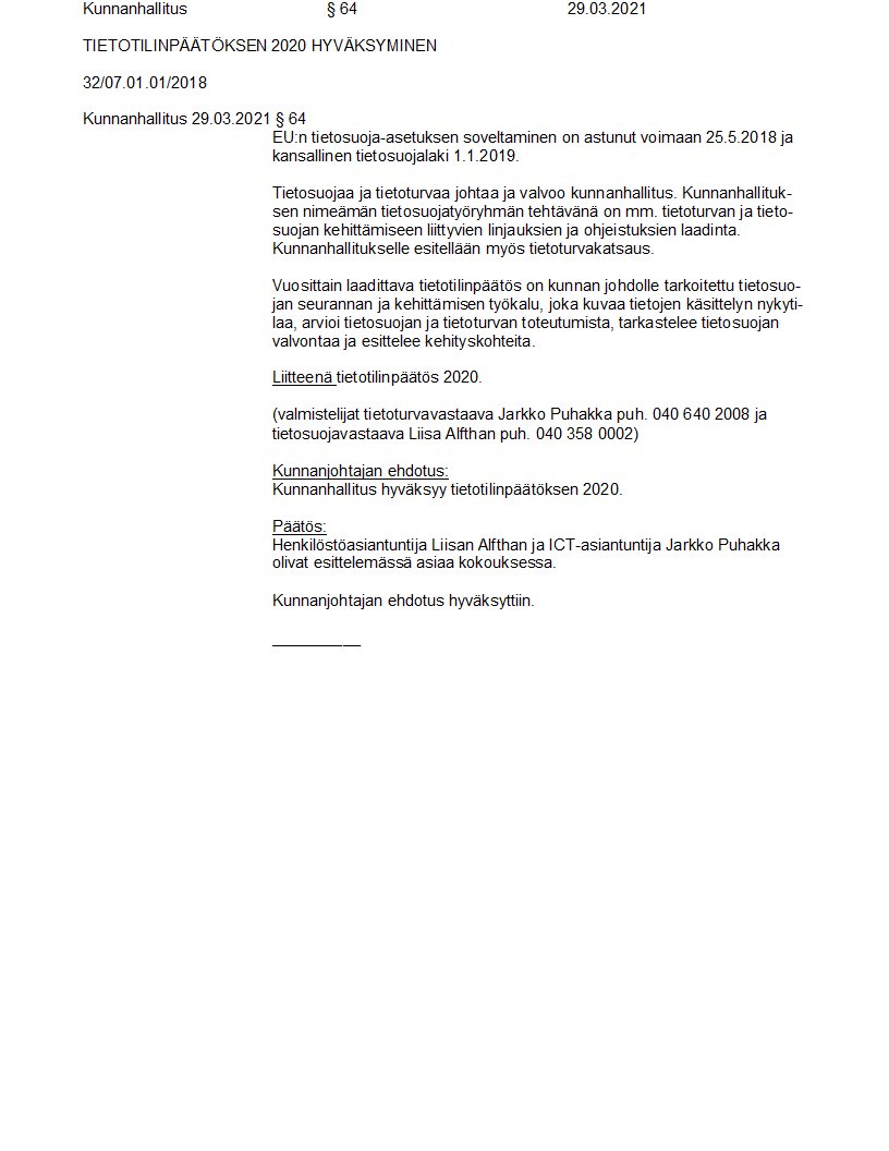 Liite 1  TIETOTILINPÄÄTÖS 2020