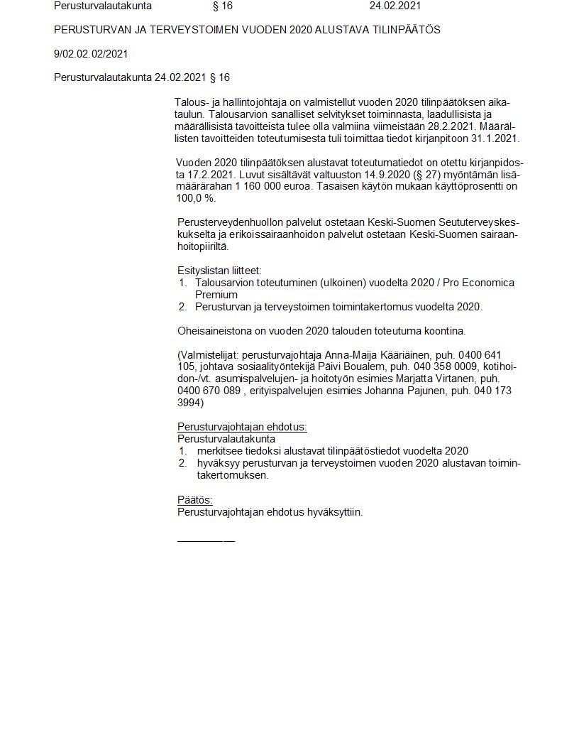 | PERUSTURVAN JA TERVEYSTOIMEN TALOUDEN TOTEUTUMA 2020 | |