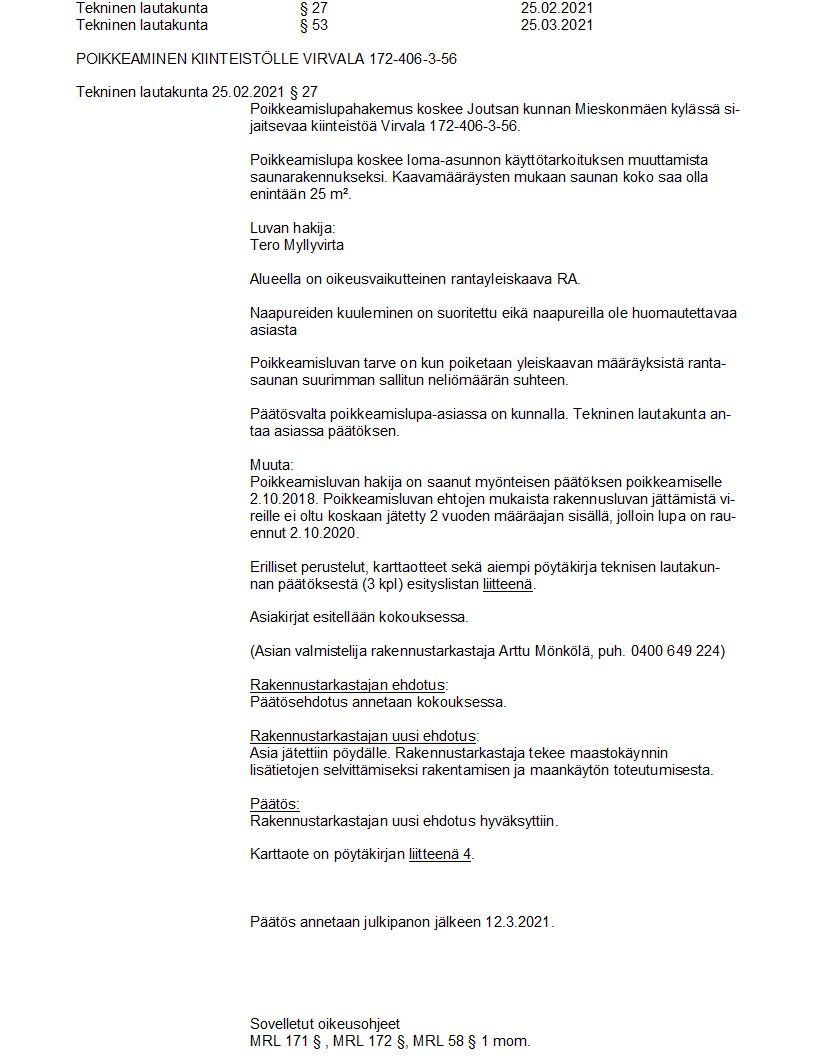 | Liite 8 | VIRVALA 172-406-3-56 POIKKEAMINEN TEKNISEN LTK:N PÖYTKIRJA OTE 20.9.2018 | |