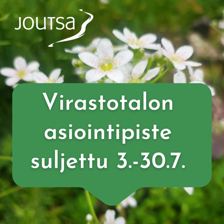 Joutsan virastotalon asiointipiste ja puhelinvaihde ovat suljettuna heinäkuussa 3.-30.7.2023.Kiireellisissä asioissa kuntaan saa kesäsulun aikana yhteyden sähköpostilla. Kunnan kirjaamon osoite on…