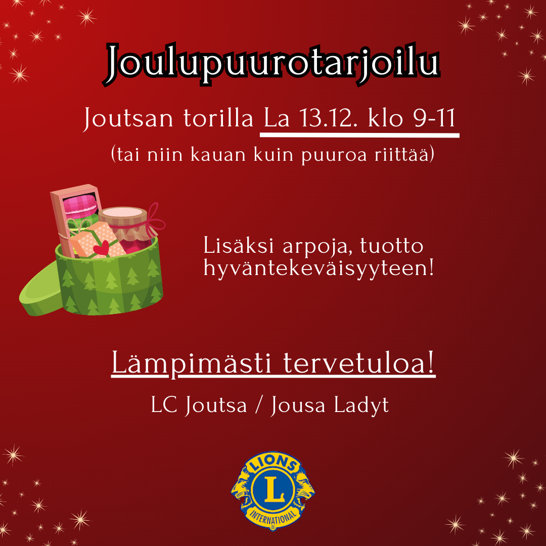 Joutsan pääkirjasto Länsitie 6, Joutsa, FinlandJoulukuusi-joululahjakeräys: käy hakemassa toive ohjeineen pääkirjaston joulukuusesta ja toteuta lapsen tai nuoren joululahjatoive! Joulukuusi toiveineen on Joutsan pääkirjastossa 10.11.-8.12.2025. Leivonmäellä ja Luhangassa ei ole omaa lahjatoivepuuta. Osallistua voi myös soittamalla Joutsan pääkirjastoon, puh. 040 358 0010, jossa soittajalle etsitään sopiva lahjatoive kuusesta.