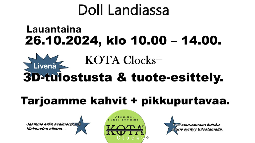 Oletko koskaan nähnyt esineiden tulostamista livenä? Nyt siihen on tilaisuus, kun Kota Clocks+ tuo tulostimia valmistamaan tuotteita paikan päällä ja kertoo 3D-tulostamisen toteuttamisesta ja mahdollisuuksista. Paikan päällä myös tuote-esittely, kahvitarjoilu ja pikkupurtavaa.