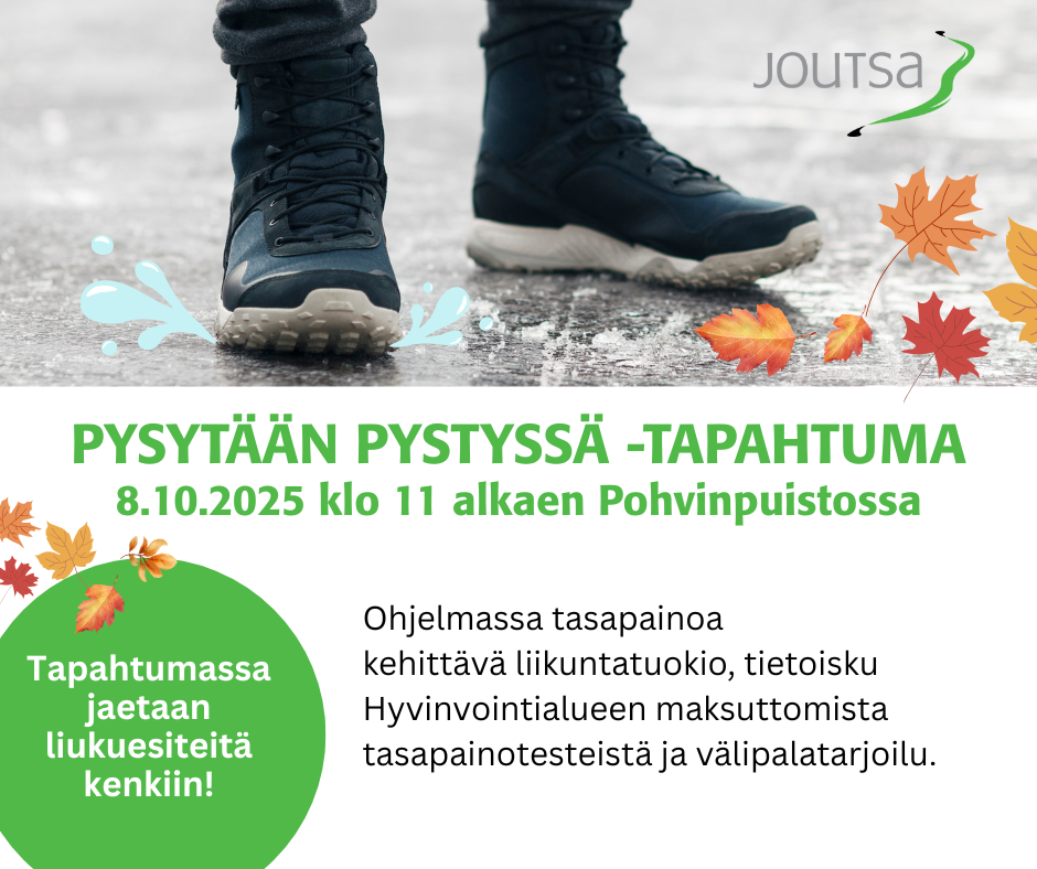 PysytäänPystyssä -tapahtuma 8.10.2025 klo 11 alkaen Pohvinpuistossa. Ohjelmassa tasapainoa kehittävä liikuntatuokio, tietoisku Hyvinvointialueen maksuttomista tasapainotesteistä ja välipalatarjoilu. Tapahtumassa jaetaan liukuesteitä kenkiin.