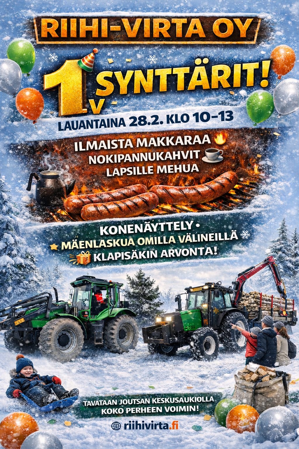 Riihi-Virta Oy 1v synttärit! Mäenlaskua omilla välineillä, makkaranpaistoa, kalustoesittely, klapisäkin arvonta. Koko perheen ilmainen tapahtuma!