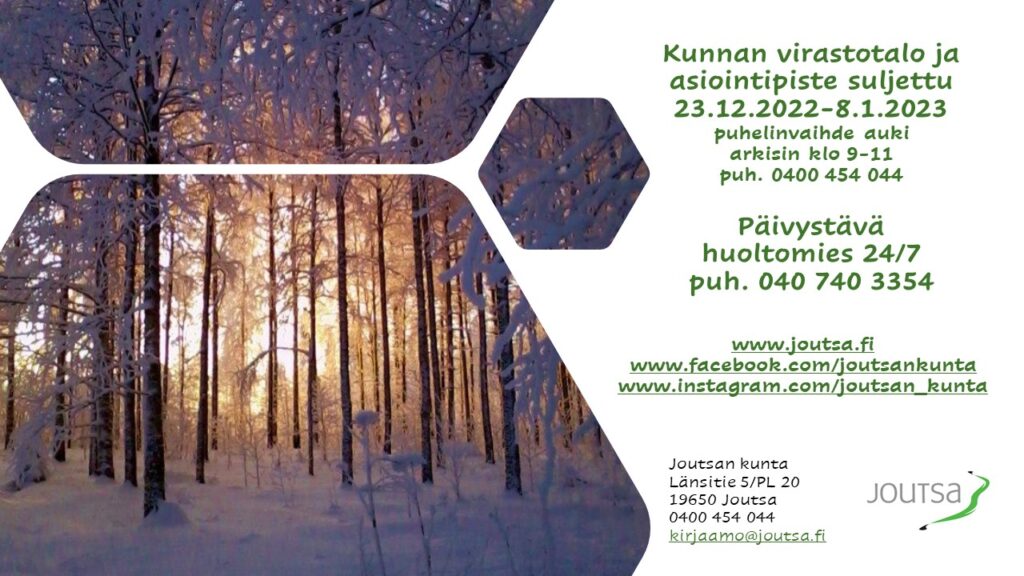 Kunnan puhelinvaihde (puh. 0400 454 044) auki ajalla 23.12.2022-8.1.2023 arkisin klo 9-11, muina aikoina voi soittaa viranhaltijoiden ja työntekijöiden suoriin puhelinnumeroihin (huomioithan mahdolliset loma-ajat).